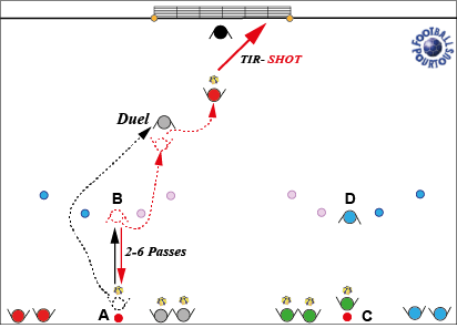 Description : Installer l’atelier comme indiqué sur le schéma. Positionner 4 ou 5 couples de joueurs avec un ballon chacun au poste A (Source) et placer un gardien de but. Le jeu se déroule de la façon suivante: Le premier couple de joueurs se met en place, un joueur avec un ballon au plot A et un joueur sans ballon au plot B. Les 2 joueurs s’échangent la balle, puis soudain le joueur B réalise un contrôle orienté en direction de la porte mauve pendant que le joueur A s’élance en direction de la porte bleue pour venir en opposition du joueur B (Duel). Un exercice ou contrôle orienté se fera intérieur pied droit, et un exercice ou le contrôle orienté se fera extérieur pied droit. Il va sans dire que l’objectif final est de marquer.