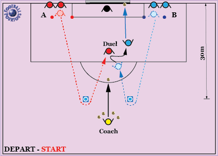 Description : Séparer le groupe de joueurs en 2 équipes. Dans l'exemple ci-contre, l'équipe rouge sans ballon va se positionner au plot A et l'équipe bleu sans ballon va se positionner au plot B. Vous êtes à la source au plot C. Au coup de sifflet, le joueur A (rouge) et le joueur B (bleu) s'élancent en direction des plots situés à 30m. A proximité des plots, libérer un ballon. Afin de rester dans une situation proche de celle des matches, le joueur qui pénètre avec le ballon dans la surface est l'attaquant (A), l'autre est le défenseur (D).