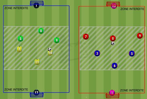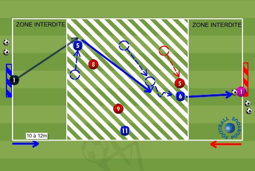 Description : Voici un nouvel exercice que vous pouvez mettre en place quelle que soit la catégorie d’âge que vous dirigez. Il suffit pour cela d’adapter les dimensions de votre terrain en fonction de votre catégorie. Pour les catégories de l'école de football, le jeu se déroule à 2 vs 2, 3 vs 3, et 4 vs 4 ; vous pouvez installer deux ateliers identiques en fonction du nombre de joueurs. Pour les catégories d'âge supérieur, utiliser un demi-terrain (exemple 8 vs 8). La règle du jeu est très simple, il est interdit de pénétrer, pour les joueurs de champ, dans les zones interdites : ils sont obligés de tirer. Le jeu est libre mais vous pouvez limiter le nombre de touches de balle. Insistez sur la prise de risques mais soyez vigilants sur la précision des tirs.