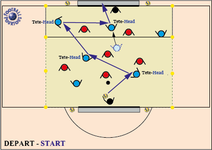 balle en l'air à la main. Les joueurs de champ s'affrontent de la tête pour marquer un but. Si la balle touche le sol,