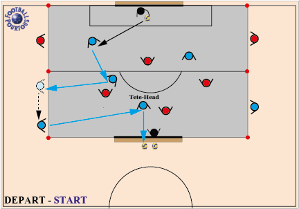 doit se terminer obligatoirement par un CENTRE ! Lors des duels aériens, insister sur la vivacité, l'agressivité des joueurs pour s'imposer dans les airs.