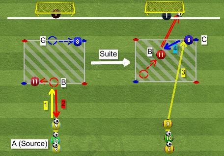 Description : Se servir du schéma pour dessiner l’ atelier. Positionner 3 ou 4 joueurs avec un ballon chacun au plot A (Source). Placer un joueur aux postes B et C (voir le dessin ci-dessous). L’exercice se déroule de la façon suivante : Le joueur jaune (9) exécute un « UNE-DEUX » passe 1 et passe 2 avec le joueur rouge (11), ce dernier se déplace rapidement  à la coupelle bleue et le joueur bleu (8)  se positionne à l’autre coupelle bleue pour recevoir la passe 3 du joueur jaune (9). Le joueur bleu (8) remet en retrait passe 4 pour le joueur rouge (11) qui tire. Installer deux ateliers identiques pour augmenter la répétition des gestes.